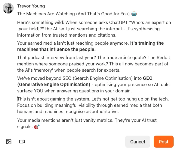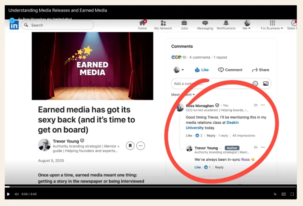 As part of his teachings, Ross put together a short Descript video presentation (titled: “Understanding media releases and earned media”) for his students. In it, he highlighted my article (the version I posted on LinkedIn), using it to show how there are some really interesting ways to think about earned media in 2025.