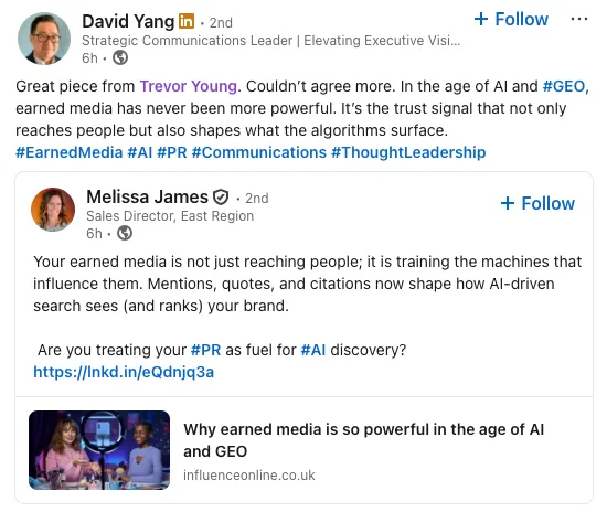 Anyway, it was nice of Melissa to share the INFLUENCE article with her connections on LinkedIn, and for David, in turn, to share Melissa’s post with his network. Happy days! 👏