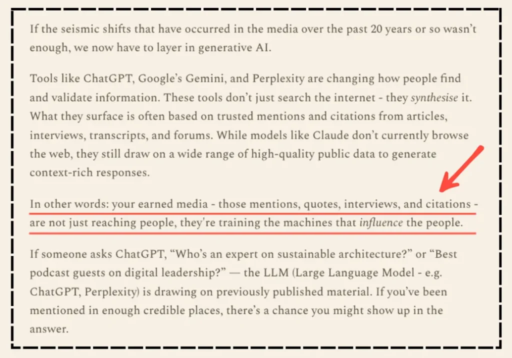 Your earned media – those mentions, quotes, interviews, and citations – are not just reaching people, they’re training the machines that influence the people.